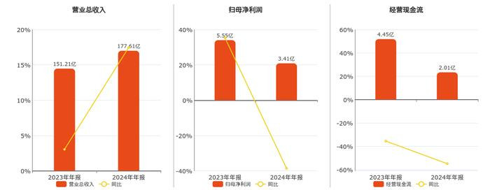 公司营业总收入为177.61亿元,较去年同报告期营业总收入增加26.40亿元,实现4年连续上涨,同比较去年同期上涨17.46%。归母净利润为3.41亿元,较去年同报告期归母净利润减少2.14亿元,同比较去年同期下降38.57%。经营活动现金净流入为2.01亿元,较去年同报告期经营活动现金净流入减少2.44亿元,同比较去年同期下降54.90%。